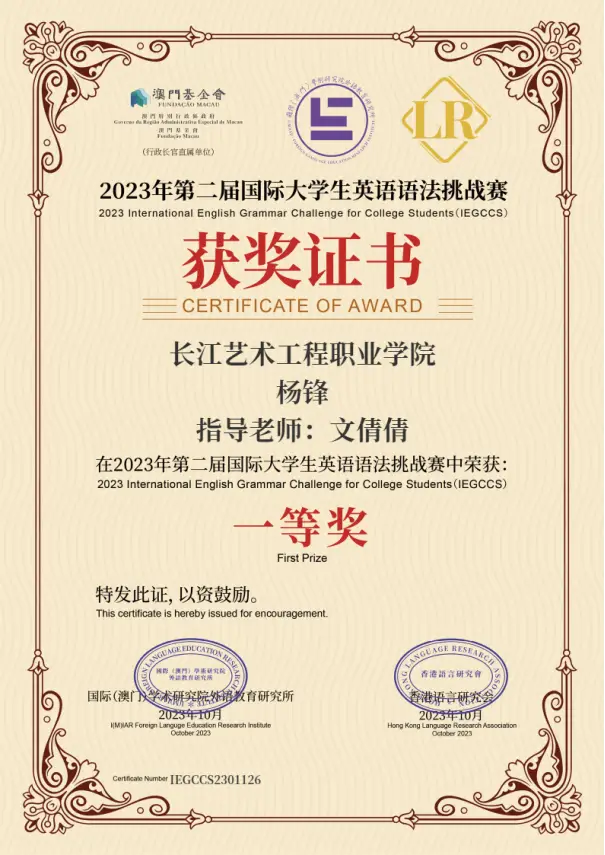 11月24日,由国际(澳门)学术研究院外语教育研究所与香港语言研究会联合举办的“2023年第二届国际大学生英语语法挑战赛(2023 International English Grammar Challenge for College Students,简称IEGCCS)”成绩揭晓,我校护理系护理专业2203班杨峰同学,在公共基础课部英语教研室教师文倩倩的指导下,荣获全国一等奖。